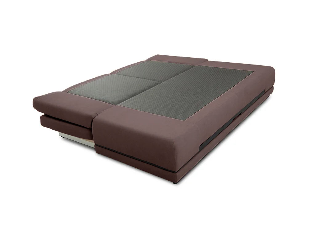 Оригинальный диван-кровать с просторным спальным местом. Cиденье дивана — мягкое и высокое, благодаря двойному настилу из высокоэластичного пенополиуретана. Удобный механизм трансформации бережет напольное покрытие. Декоративные накладки и ножки выполнены из шпона дуба цвета венге или ореха. Вместительный бельевой ящик идеально подходит для хранения спальных принадлежностей