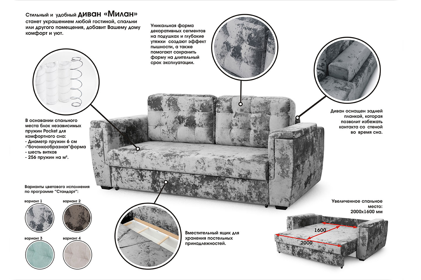 Стильный и удобный диван "Милан" станет украшением любой гостиной, спальни или другого помещения, добавит Вашему дому комфорт и уют.
