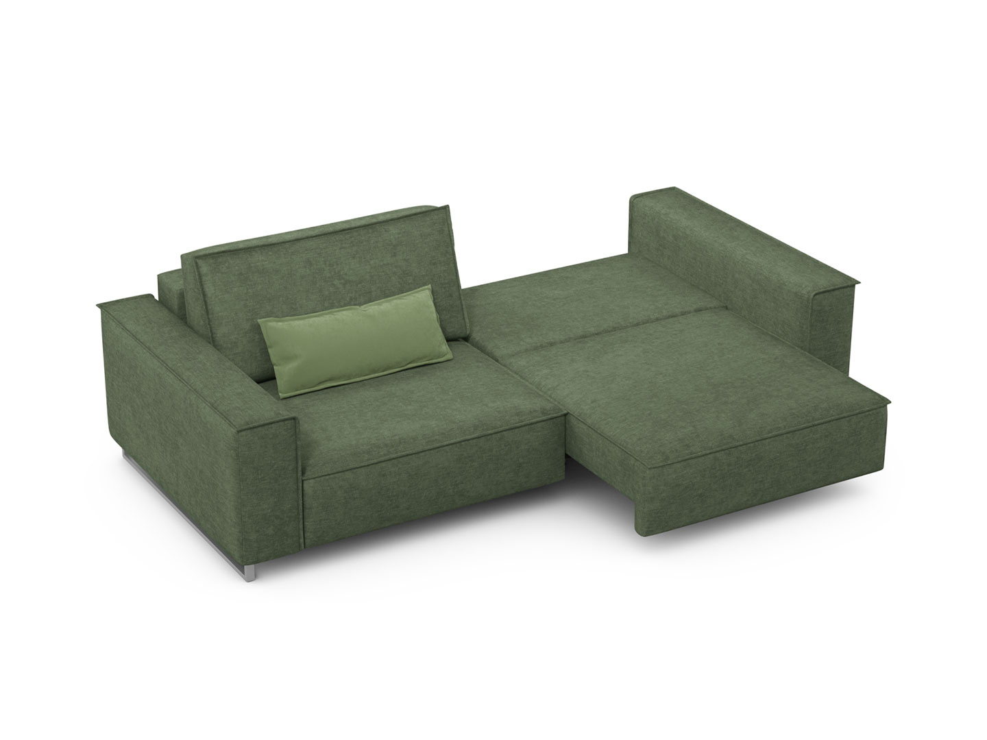 Благодаря трансформируемым модулям, диван превращается в мягкий подиум для отдыха, к которому можно подойти с разных сторон.