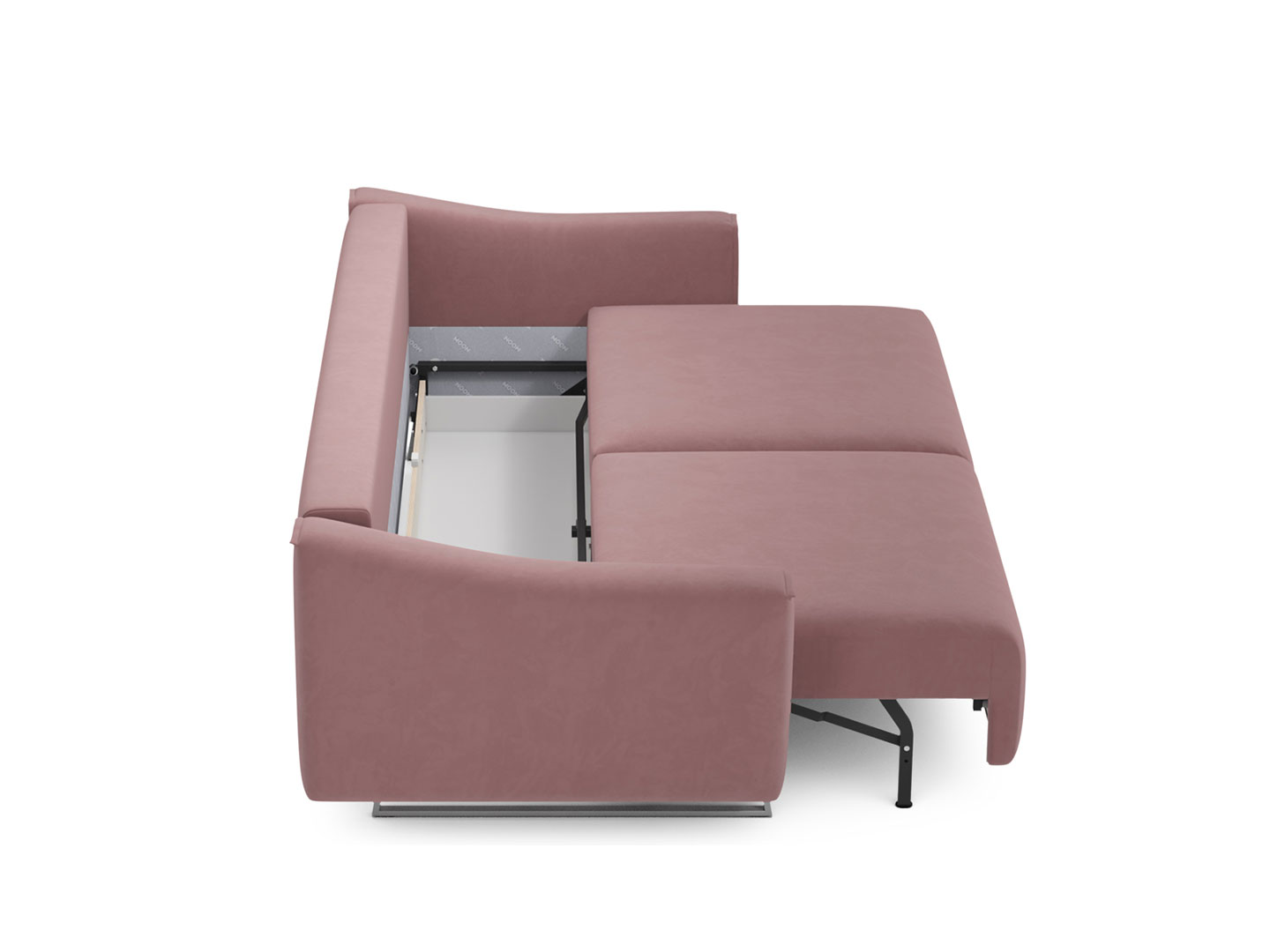 Диван стоит на двух основных трапециевидных опорах, в то время как дополнительные остаются скрытыми, появляясь плавно и бесшумно в единственно нужный момент — при трансформации дивана в кровать.