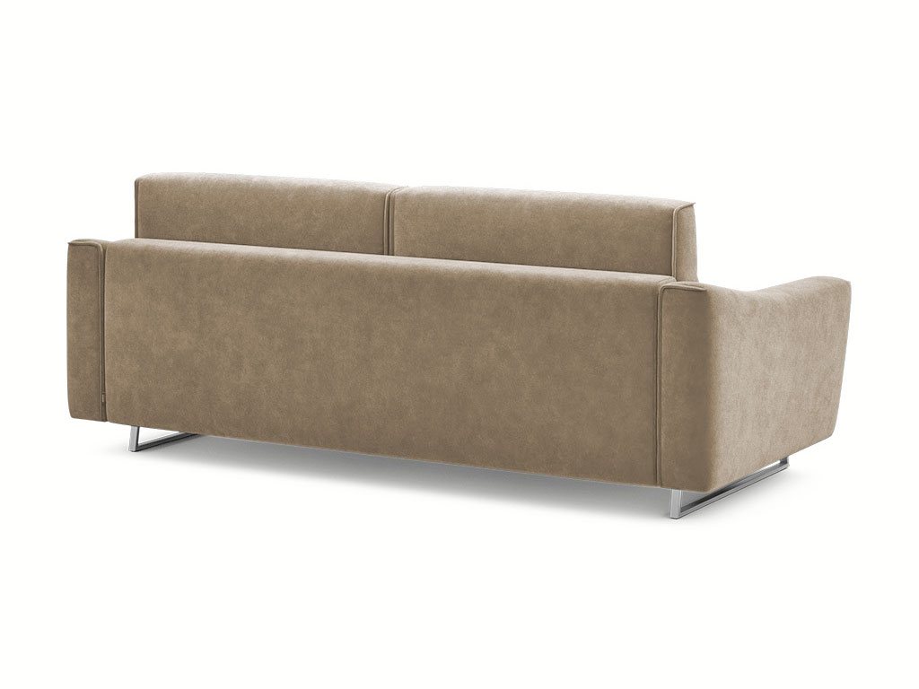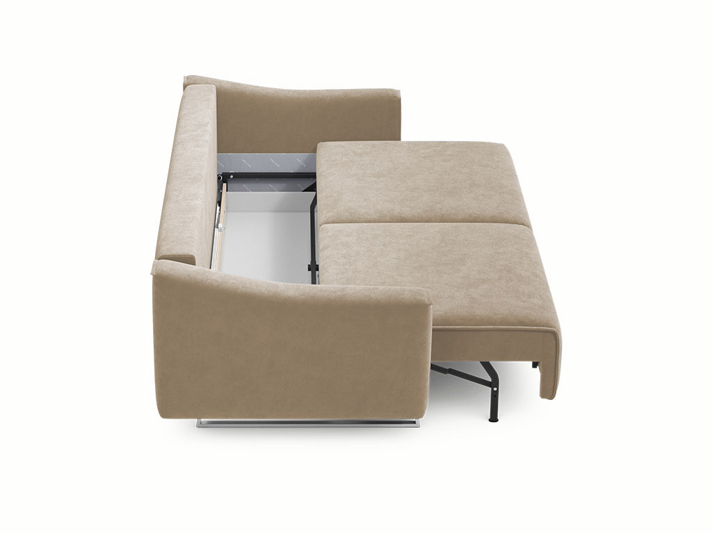 Диван стоит на двух основных трапециевидных опорах, в то время как дополнительные остаются скрытыми, появляясь плавно и бесшумно в единственно нужный момент — при трансформации дивана в кровать.