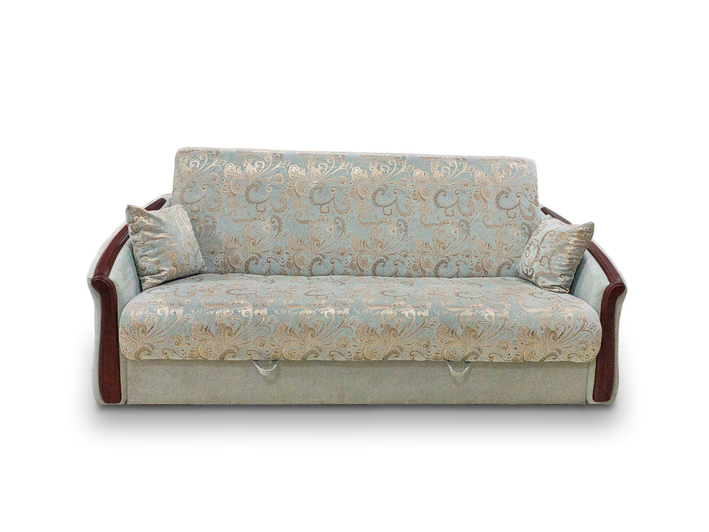 Механизм трансформации – диван книжка с откатом. Дополнительный выкатной механизм дивана – книжки "Олимп" позволяет размещать диван вплотную к стене, при раскладывании его не нужно отодвигать, а мягкая задняя планка исключает контакт со стеной. Спальное место – усиленный пркжинный блок + высокоэластичный ППУ. Можно выбрать блок независимых пружин или стандартный блок Bonelle. Деревянный декор из бука с многослойным лаковым покрытием. Направляющие и ножки из твёрдых пород дерева. Бельевой ящик из ламинированного ДВП и ДСП