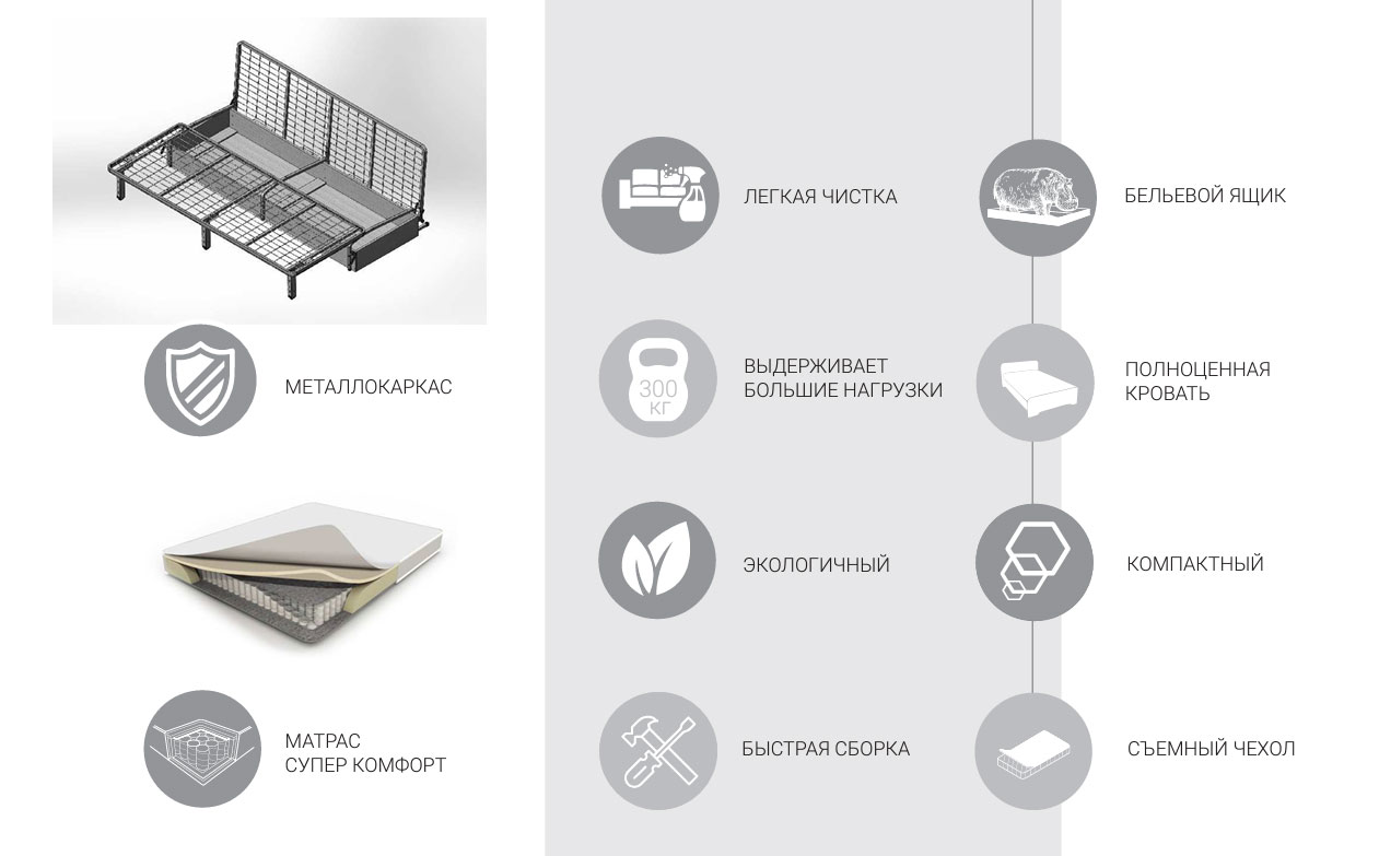 - прочный, надежный механизм для интенсивной эксплуатации. Распределенная нагрузка на спальное место 300 кг металлокаркас имеет защитную порошковую окраску. Не подвержен коррозии, влиянию перепадов температур и повышенной влажности