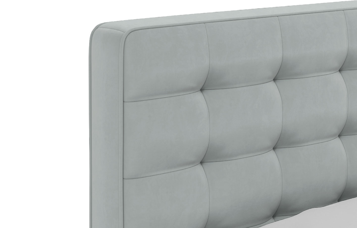 Дизайн наделен сбалансированными объемными формами, которые придают интерьеру мягкость и уют. Стежка в виде квадрата и кант на изголовье придают кровати особый шик. Шарм общей стилистике дизайна придают подушки-валики.
