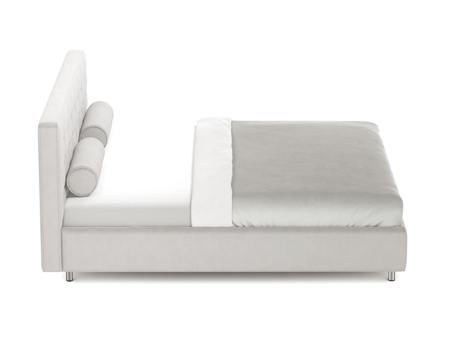 Дизайн наделен сбалансированными объемными формами, которые придают интерьеру мягкость и уют. Стежка в виде квадрата и кант на изголовье придают кровати особый шик. Шарм общей стилистике дизайна придают подушки-валики.