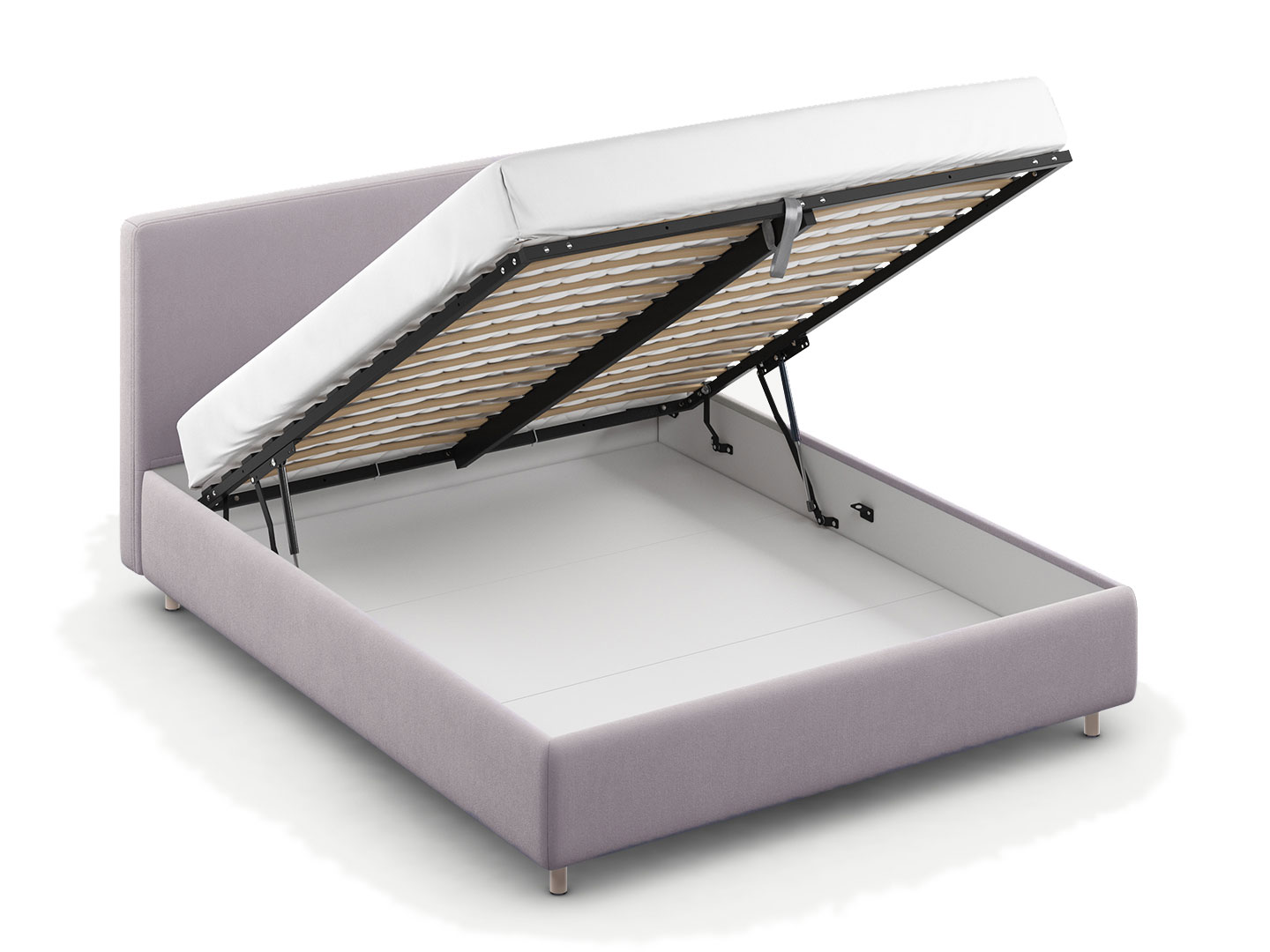 Вместительная емкость под кроватью без внутренних перегородок позволяет использовать для хранения вещей 100% пространства.