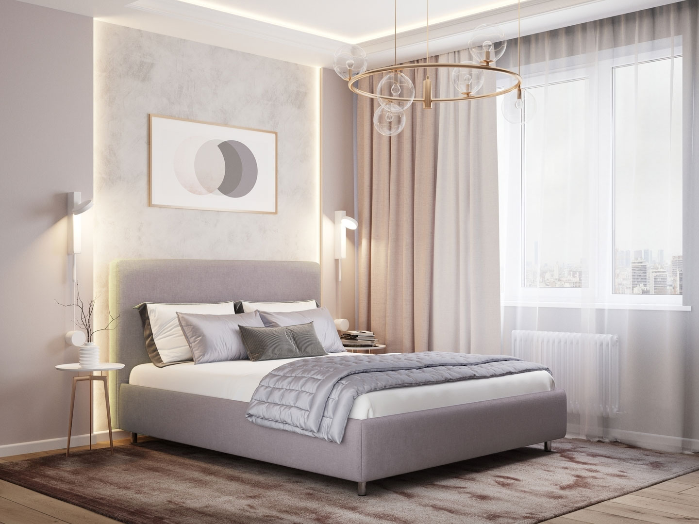 Прекрасным дополнением кровати является банкетка, которая идеально завершает композицию, подчеркивая общую стилистику интерьера.