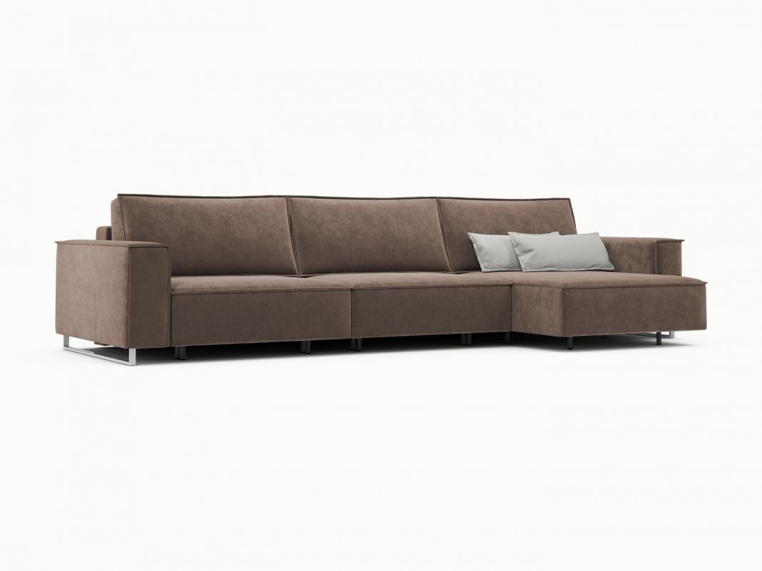 Низкая глубокая посадка, оригинальные опоры и главная фишка дивана — демонстративные швы наружу — соединяют стиль, комфорт и практичность.