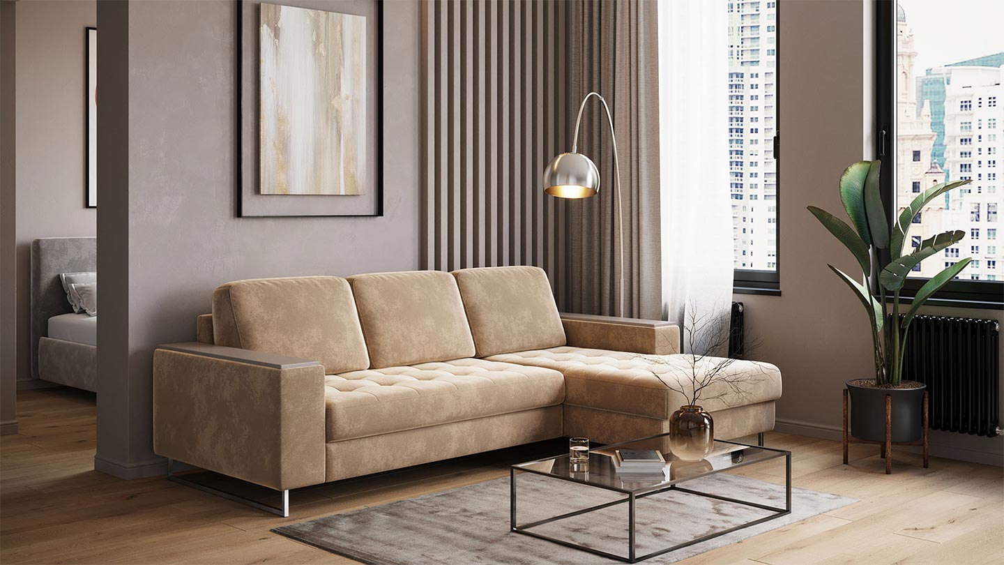 Секция канапе обеспечивает дополнительное пространство для отдыха, благодаря которому Вы можете располагаться с максимальным комфортом, вытянув ноги. Под данной секцией расположен вместительный бельевой короб.